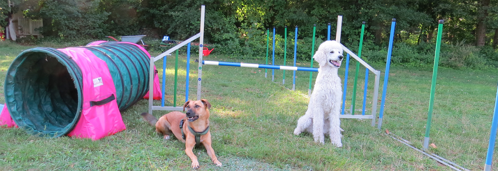 In einem Agilityparcour kann es bis zu 20 Geräte geben, die fehlerfrei bewältigt werden sollten. Die Hindernisse sind den jeweiligen Größen der Hunde angepasst. Die Anordnung der Hürden, Tunnel, Wippe, Slalom etc. ist immer wieder neu geplant und es braucht ein eingespieltes Team um den Parcour zu meistern.